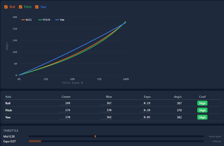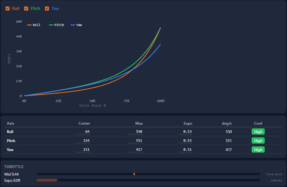 Ultra-smooth, invisible corrections. Low max rate, high center sensitivity, nearly linear expo.