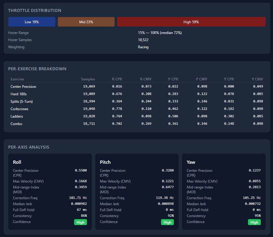 Tight precision at center stick for gate tracking. High max rate for committed snaps and 180s.